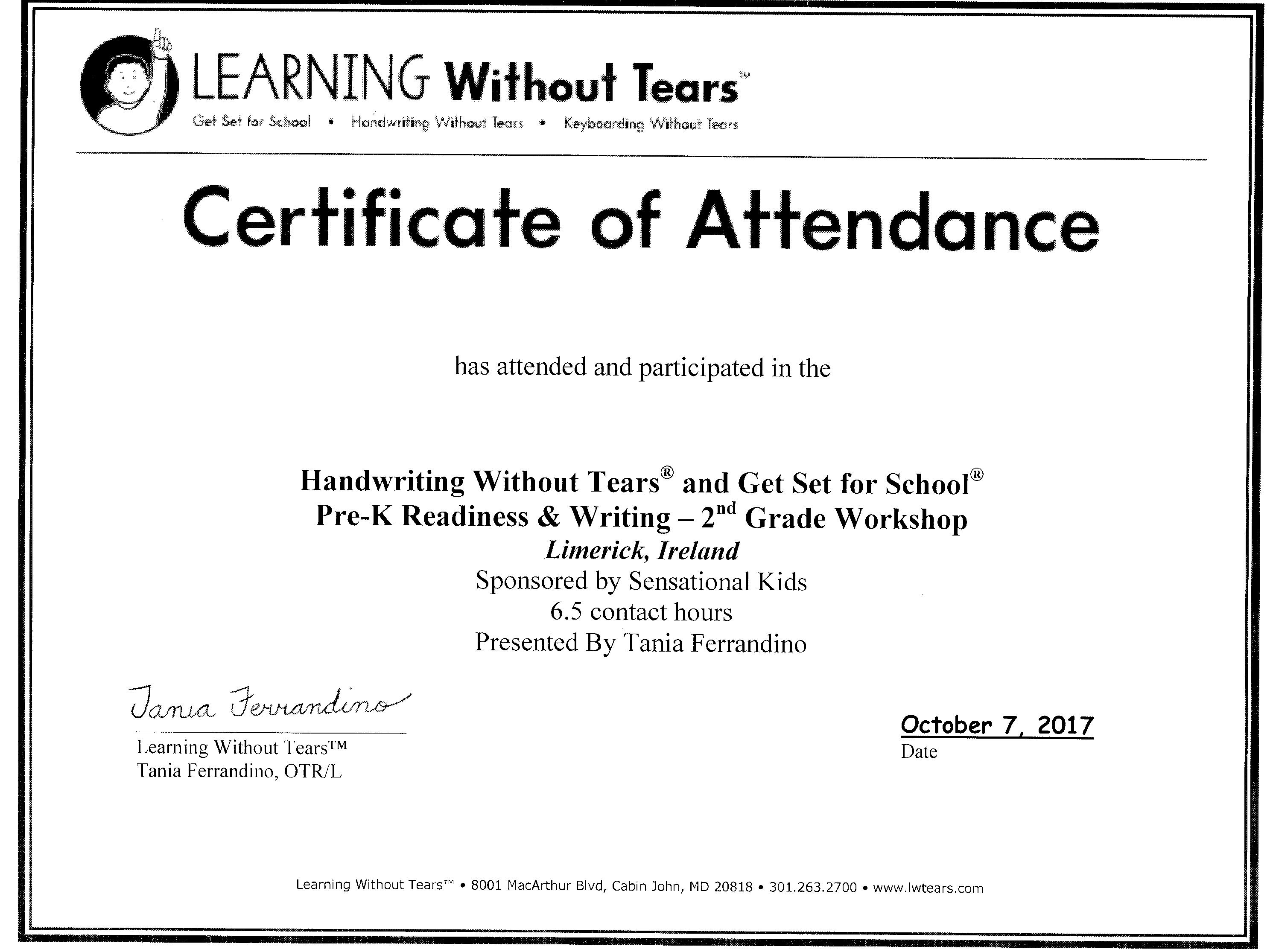 Just back from Limerick after attending the “Handwriting without Tears” full day course. It was an amazing course full of valuable information which will benefit the children I work with. Tania Ferrandino did an outstanding job in presenting this course. I can’t wait to start using these teaching methods. The course was sponsored by Sensational Kids, do check out their website.